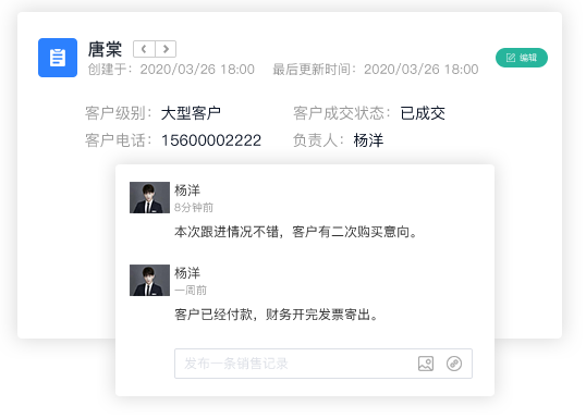 设置客户信息字段,针对不同业务的企业搭建专属客户卡片;随时随地联系客户,反馈跟进情况并建立下一步联系计划;