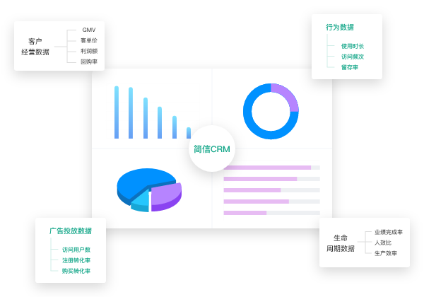 结合简信CRM各个模块的使用,汇聚多类用户数据,通过整合分析,完成客户的统一识别,构建精准360°客户画像。