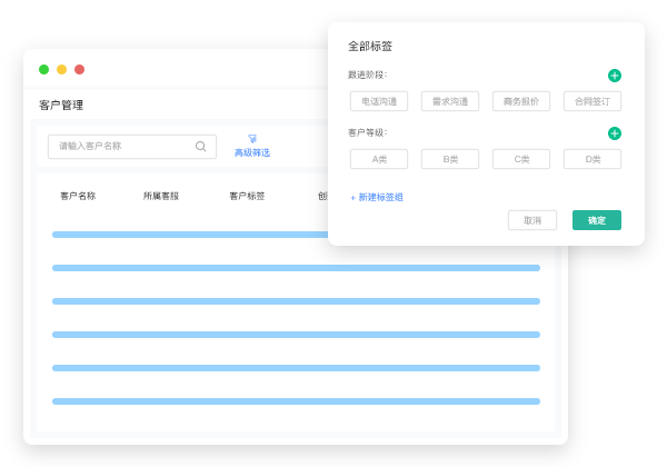,创建及维护企业标签,轻松构建标签体系根据标签规则,系统自动标记客户标签,高效响应运营诉求